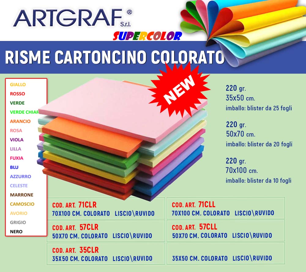 Disponibili nei formati e nei colori: 24x33 cm. fg. 10 - azzurro, rosso, nero, giallo e verde; 24x33 cm. fg. 20 - azzurro, rosso, nero, giallo, verde, arancio, marrone, viola, rosa, verde prato; 33x48 cm. fg. 10 - azzurro, rosso, nero, giallo e verde;